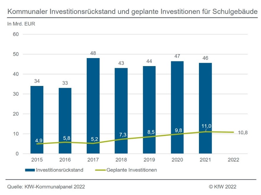 Laut aktueller Sonderauswertung von KfW Research 2022 melden rund 17 Prozent der Kommunen einen gravierenden Sanierungsrückstand bei den Schulgebäuden und damit insgesamt ein Investitionsdefizit von mehr als 45 Mrd. Euro. Städte, Gemeinden und Kreise haben in den vergangenen Jahren auf die neuen Anforderungen durch Inklusion, Digitalisierung und die Erfordernisse der Corona-Pandemie reagiert und auch ihre Investitionen für die Schulinfrastruktur gesteigert, wie die Analyse zeigt. Jedoch bleibt die prekäre Situation durch die steigenden Baupreise und die Energie-Krise bestehen.